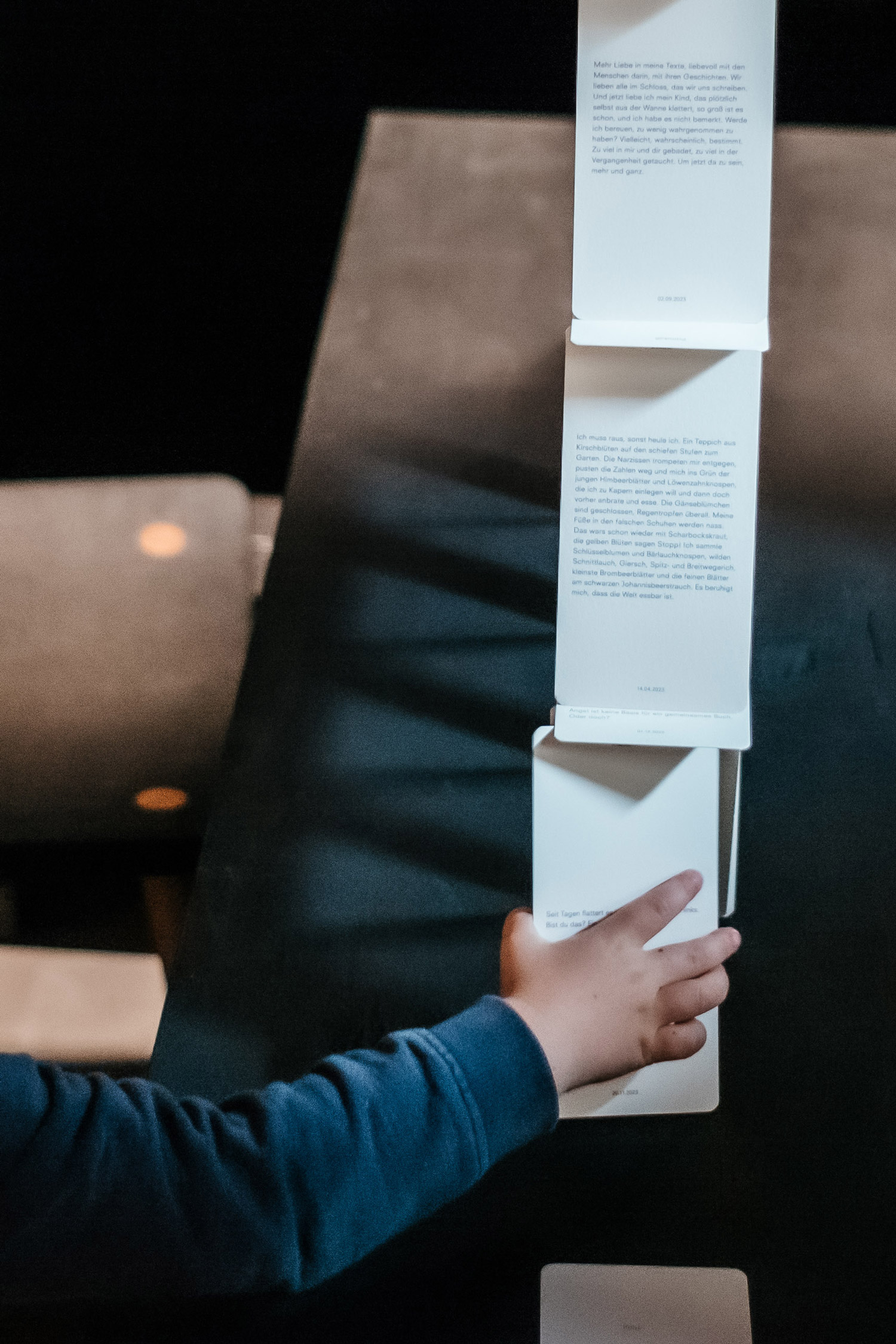 Christina Schmid träumt von einem Ort für Buchkunst in Stuttgart. Im ITO-Raum wird ihr Buchtraum temporär Wirklichkeit. Lose Anfänge und Enden, Textfragmente, ein Hörstück aus Briefen und potenzielle Bücher erzählen vom Leben und Lieben auf Papier. Im Gespräch mit der Autorin, Gestalterin und Verlegerin entstehen individuelle Lesungen und Wege durch ihren Textteppich.