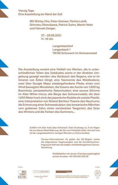 Mit der Veröffentlichung des Buches "Vierzig Tage" kommt das gleichnamige Residency- und Ausstellungsprojekt zum Abschluß. Unter dem Titel "Vierzig Tage. Eine Ausstellung am Rand der Zeit" wurden im vergangenen Jahr Arbeiten von Shirley Cho, Peter Granser, Florina Leinß, Patrick Suhm, Shinroku Shimokawa und Hannah Zenger in verschiedenen Settings gezeigt: Zuerst am Langenbachhof im Schwarzwald, anschließend im ITO Raum und zuletzt in der Galerie Kernweine.