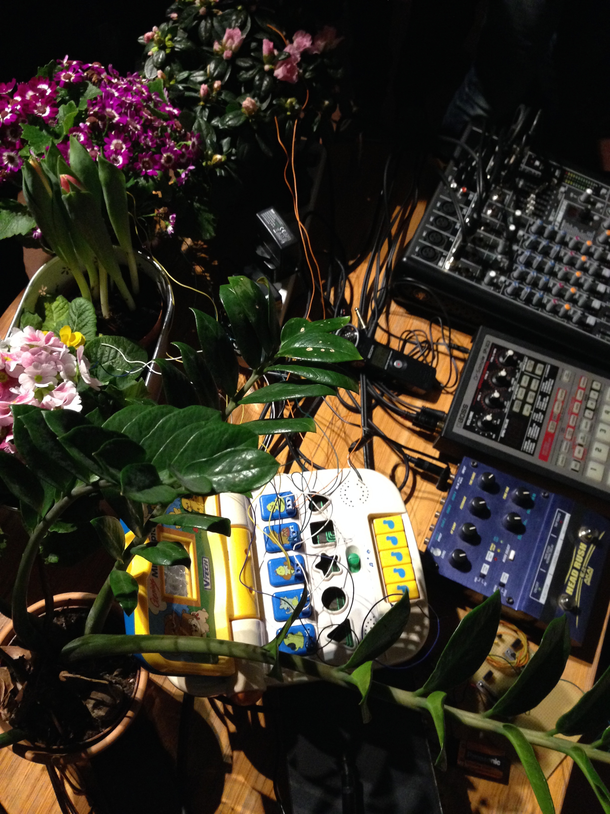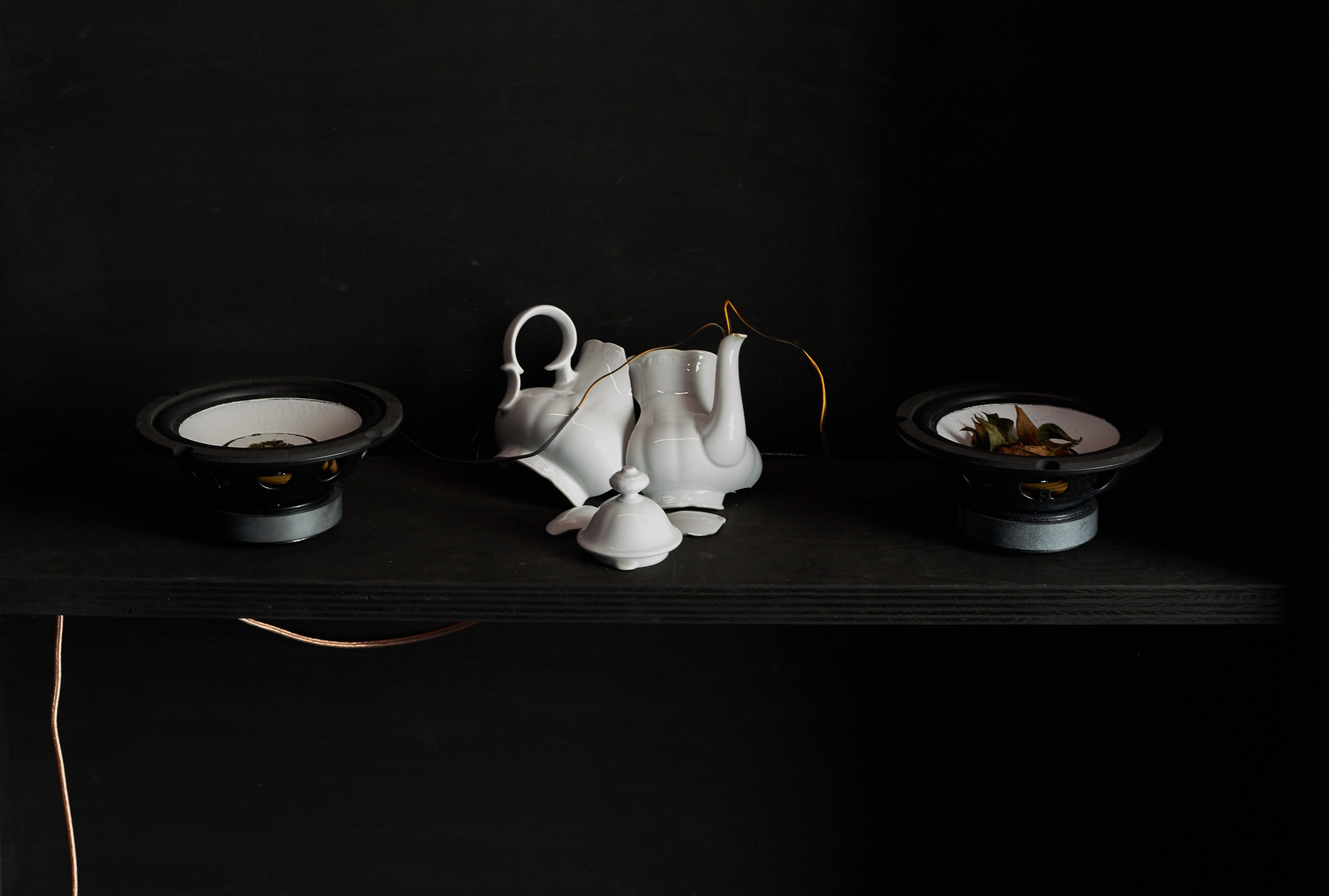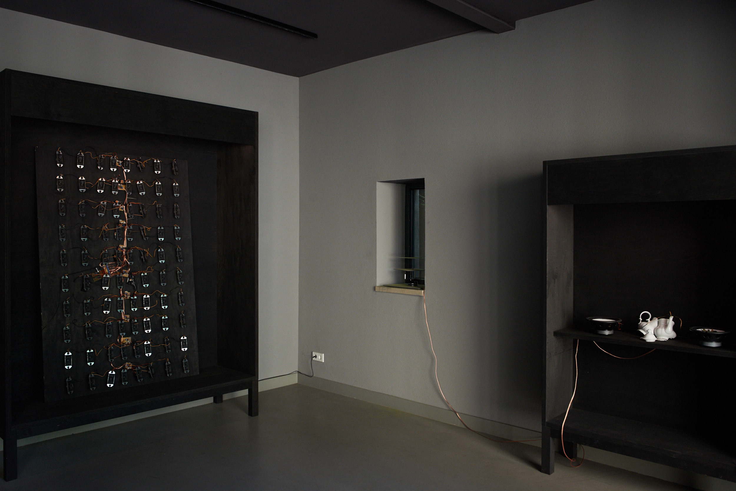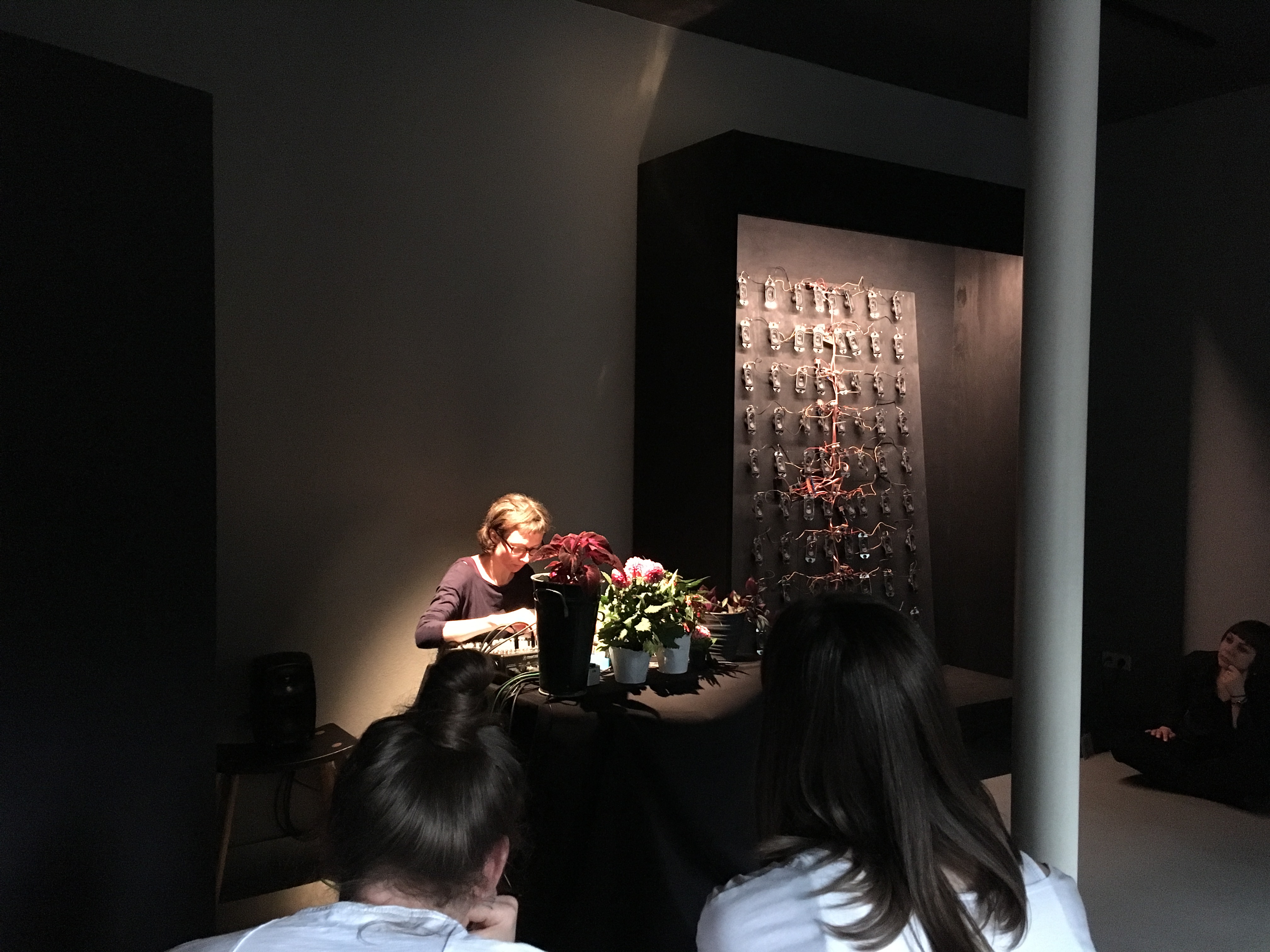 At the intersection of a sound installation and a performance, the duo “condensed and falling in separate drops” creates a resonating territory of frequencies. Standing waves, physical boundaries of sound that can be felt as they pass through you, sonically materialise the space between walls, physically connecting all present. Amidst this atmosphere, sounds of plants plugged to an array of oscillators populate, develop and emphasise the delicate stability of the territory.