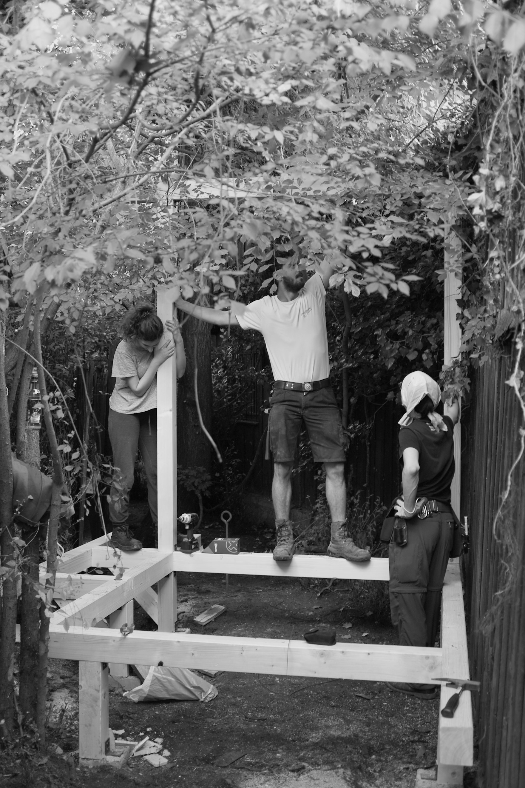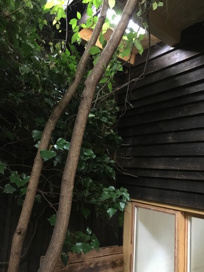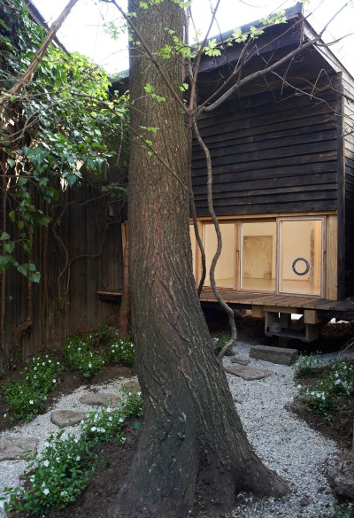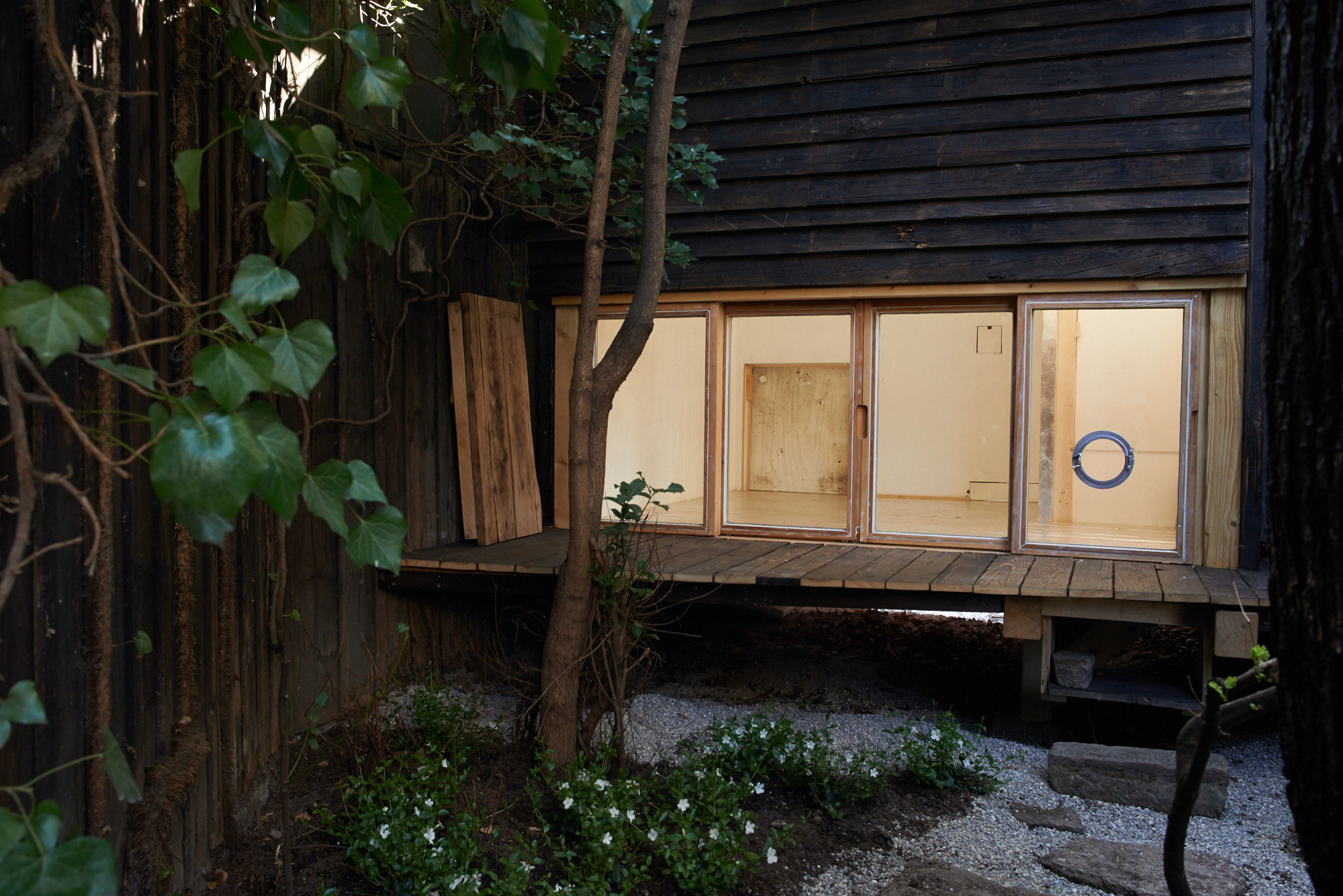 Unser Ort ist ein versteckter Zwickel, eine dreieckige, spitz zulaufende Fläche, die von zwei Wänden begrenzt direkt am ITO Projektraum liegt. Der japanische Künstler Idetsuki Hideaki hat in Kooperation mit den Studenten der Universität Stuttgart - Sofia Holder, Lukas Gesell, Tara Hariri, Iván Camilo Nieto, Maximilian Schäfer, Benjamin Vetter, Alp Yilmaz – und IRGE / e1nszue1ns diesen vergessenen Ort neu gestaltet und einen Raum gebaut, der gleichzeitig geschützt und offen ist, die Grenzen zwischen Natur und Kultur und zwischen Innen und Außen verwischt. Ein Rückzugsort fernab des Trubels, der jeweils nur einen Besucher für eine bestimmte Zeit aufnehmen kann. Zusätzlich wurde die brachliegende Fläche in einen Garten verwandelt.