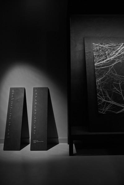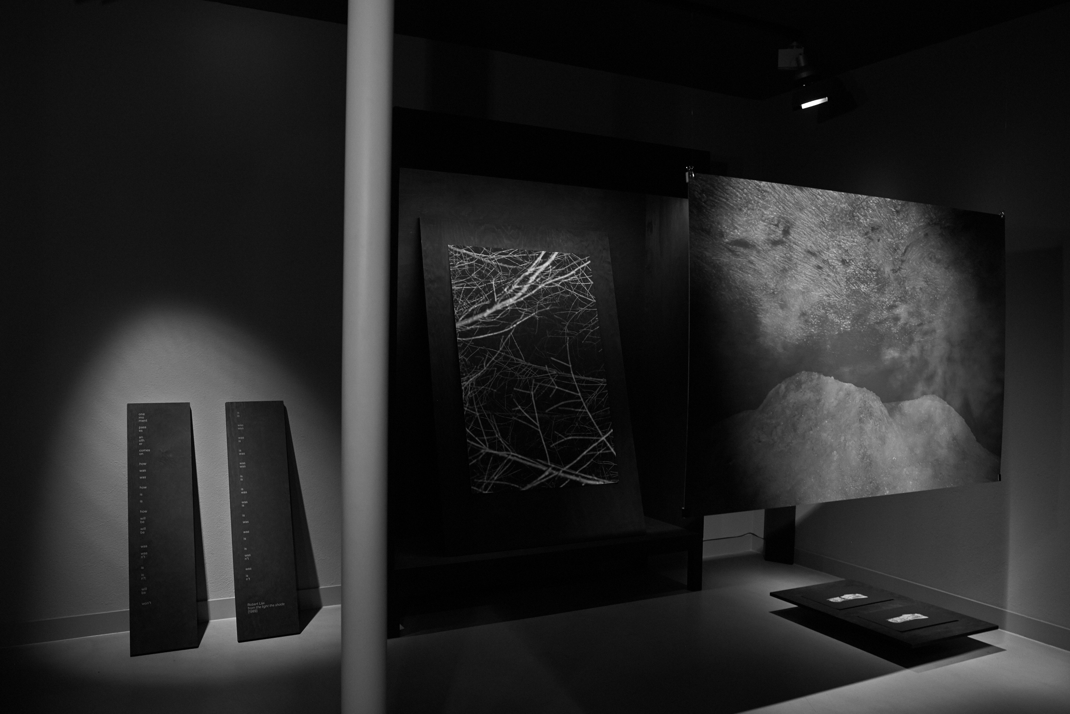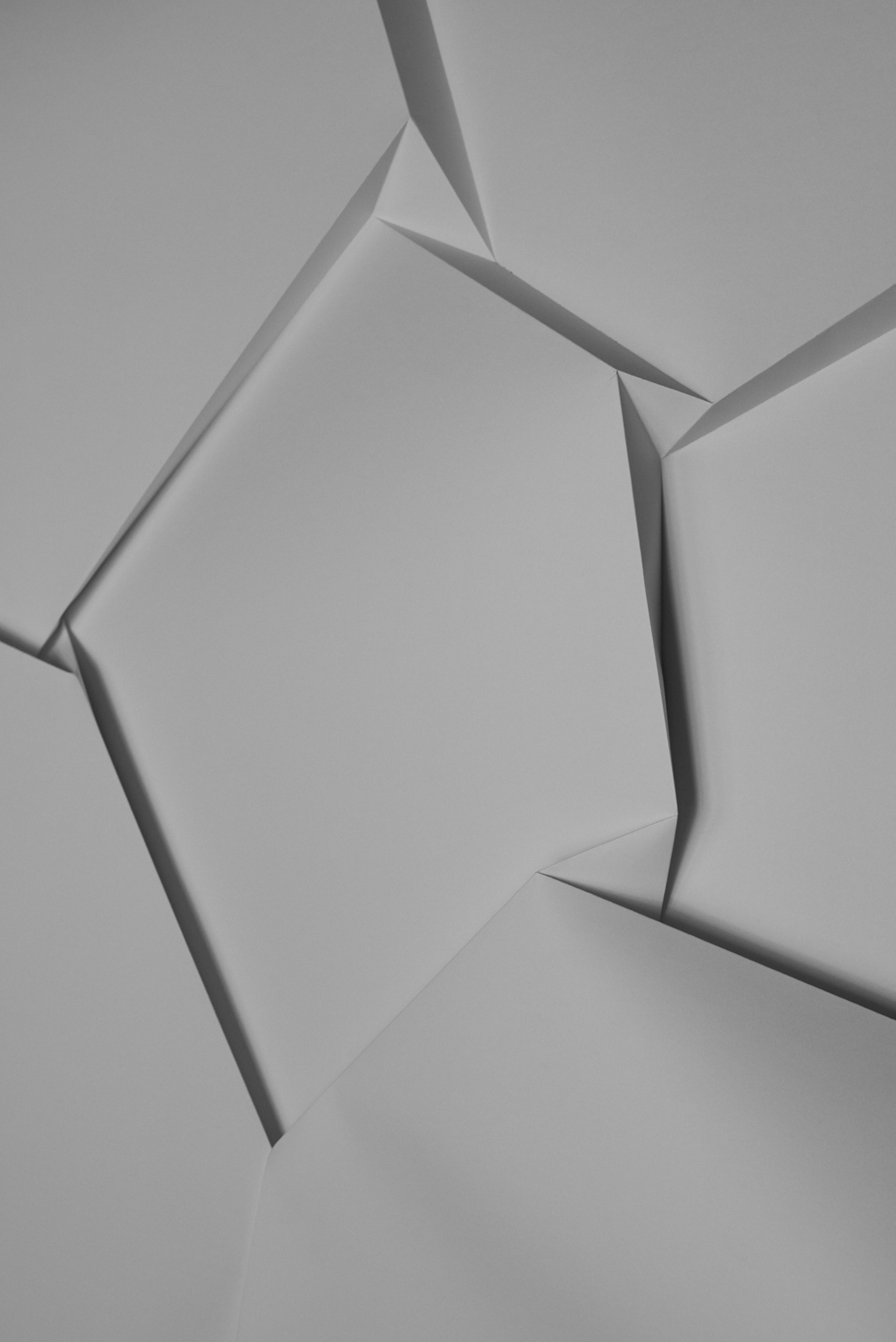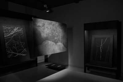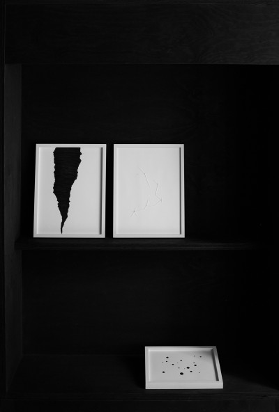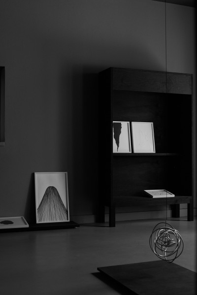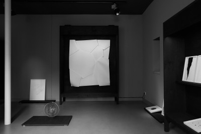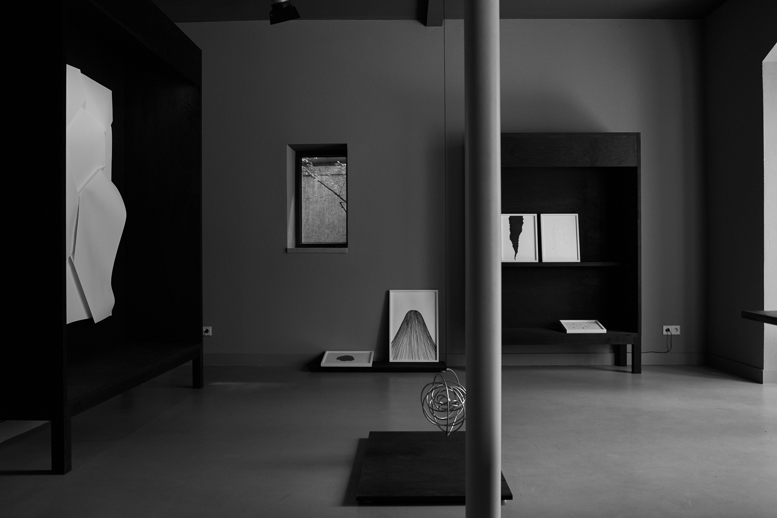 Flaches Papier, gefaltet, wölbt sich in den Raum, Spannungen fliehen. Wirbelnd legt sich Schwärze in die Szene, das dunkle Auge des Sturms. Ein Schlag, Risse verbinden sich, ziehen sich über das Glas. Gefurchter Brocken, die Replik eines der unzähligen Gestürzten. Eine Linie windet sich in Kurven und knotet einen Raum. Schwärme pulsieren, lebendige Wolken. Alles fließt.