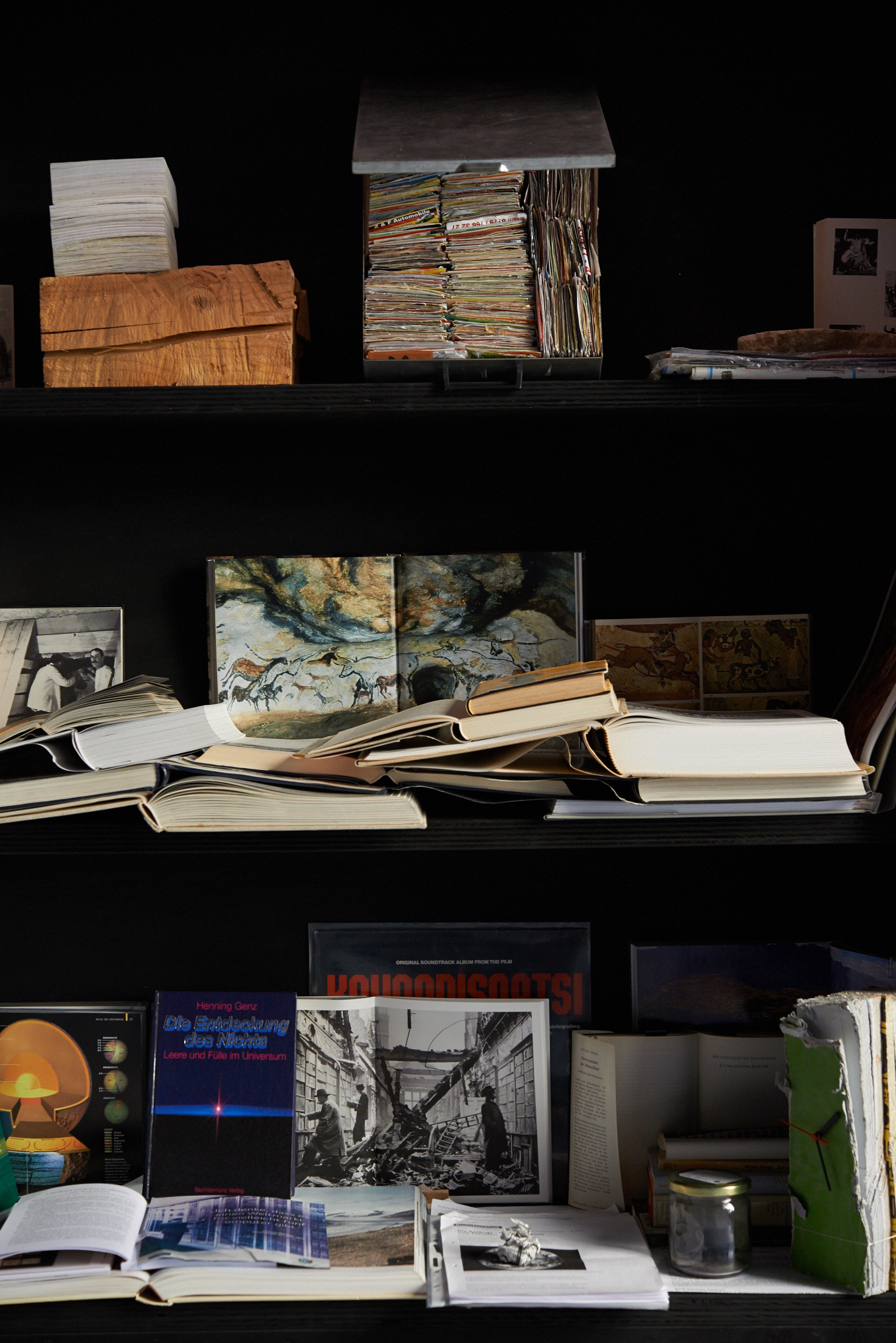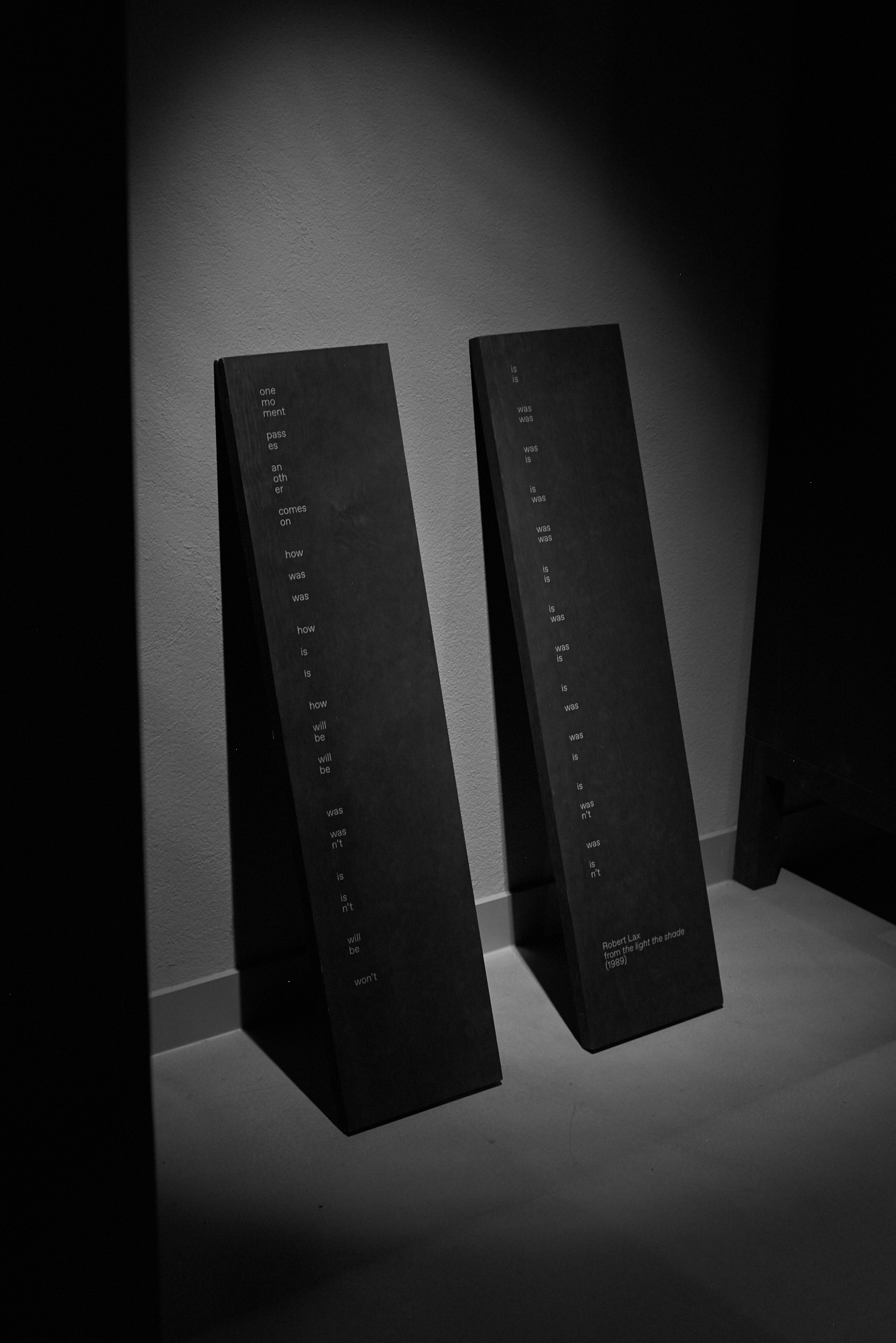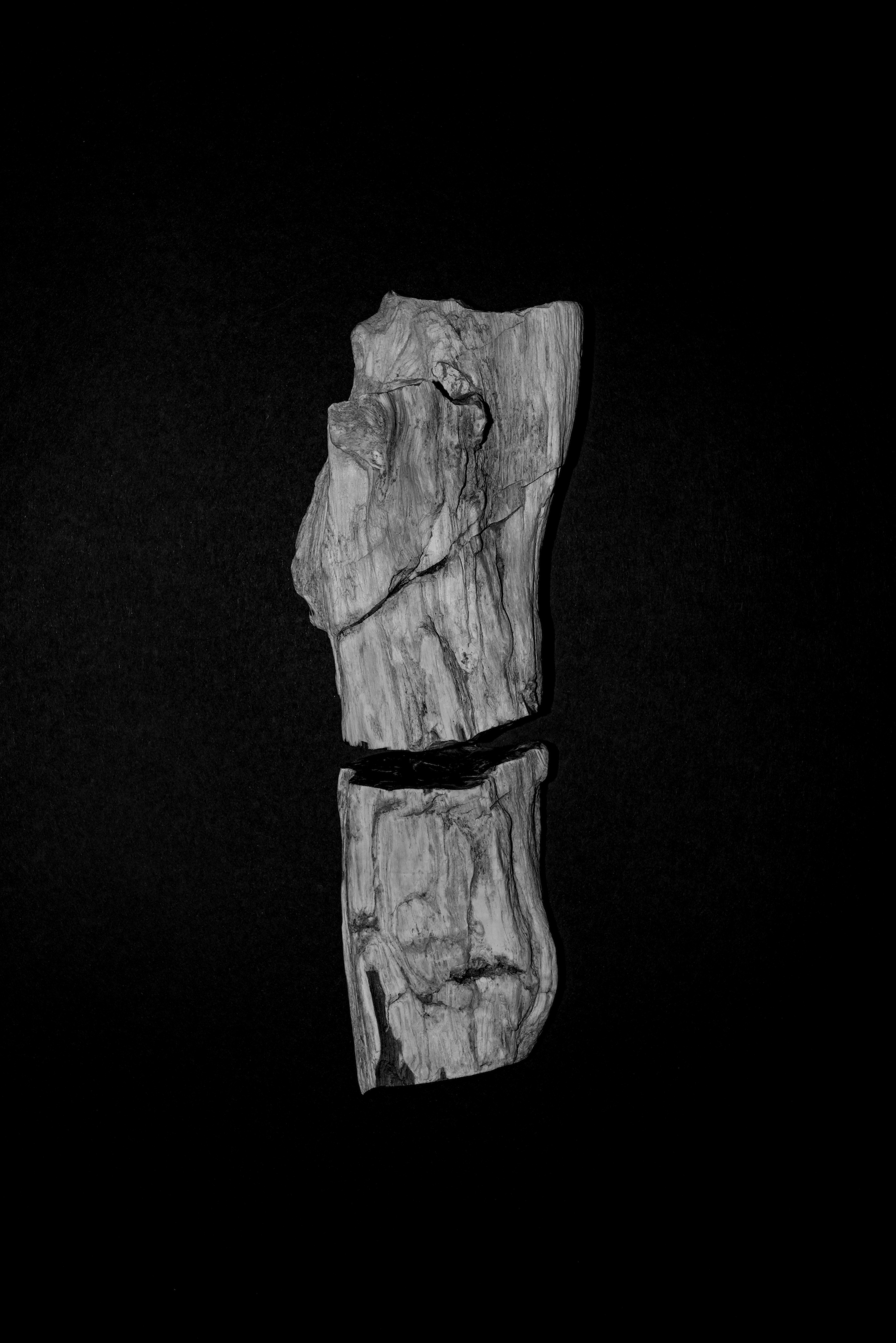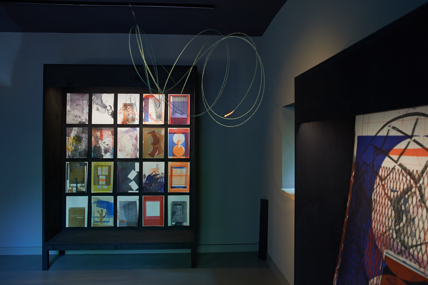 Flaches Papier, gefaltet, wölbt sich in den Raum, Spannungen fliehen. Wirbelnd legt sich Schwärze in die Szene, das dunkle Auge des Sturms. Ein Schlag, Risse verbinden sich, ziehen sich über das Glas. Gefurchter Brocken, die Replik eines der unzähligen Gestürzten. Eine Linie windet sich in Kurven und knotet einen Raum. Schwärme pulsieren, lebendige Wolken. Alles fließt.