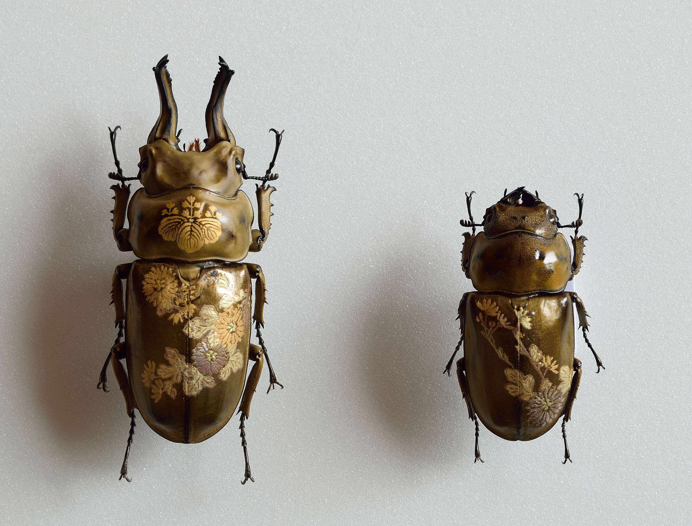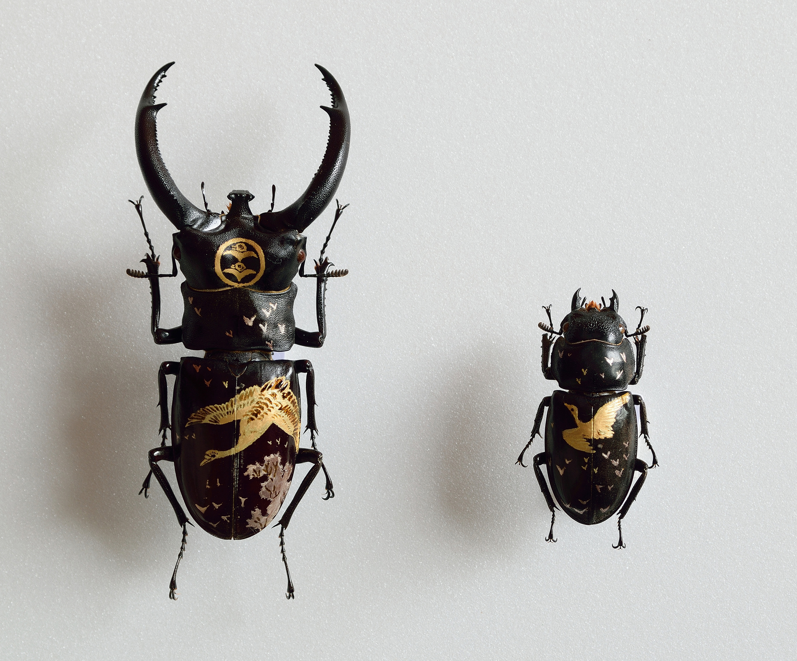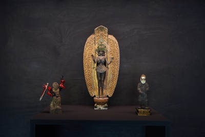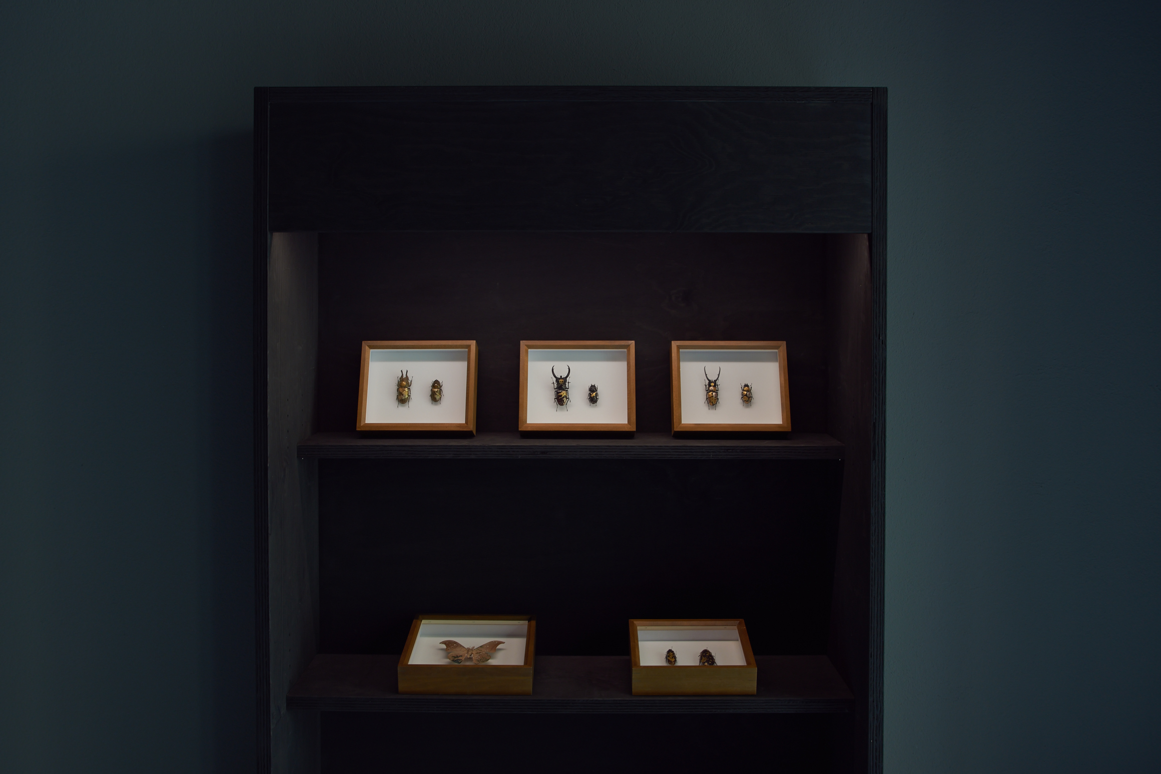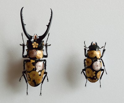 Akihiro Higuchi's fein inszeniertes Spiel mit Kultur, Natur und Kreatur zeugt von einer ästhetisch anspielungsreichen Raffinesse, die in Japan in der Tradition des Mitate, einer ursprünglichen literarischen Form der Beschreibung steht. Unter Mitate versteht man auch das Spiel mit assoziativen Stellvertretern vorgegebener Formen. Berühmte Meister der Teezeremonie aus dem 16. Jahrhundert etwa ersetzten wertvolle Teeschalen durch formverwandte, jedoch minderwertige, nicht für den Teegenuss vorgesehene Gefäße. Die Kunst des Mitate zeigt sich ebenso in den animalischen Werken von Akihiro Higuchi. Etwa darin, dass der Künstler mit dem schelllackähnlichen Glanz der Käfer auf die glänzende Lackoberfläche japanischer Schalen und Gefäße anspielt. In doppelter Hinsicht ersetzt Natur damit den kulturellen Hintergrund, als materieller Bildträger sowie als perfekter Ersatz für einen malerisch erzeugten Untergrund. Ähnlich verfährt Higuchi mit bunten und populären Spielzeugfiguren, die er neben klassische Götterdarstellungen platziert. Die Figuren aus den gegensätzlichen Welten von High and Low haben jedoch eines gemeinsam: ihre Körperhaltung, die sich nach einem tradierten Kanon ausrichtet.