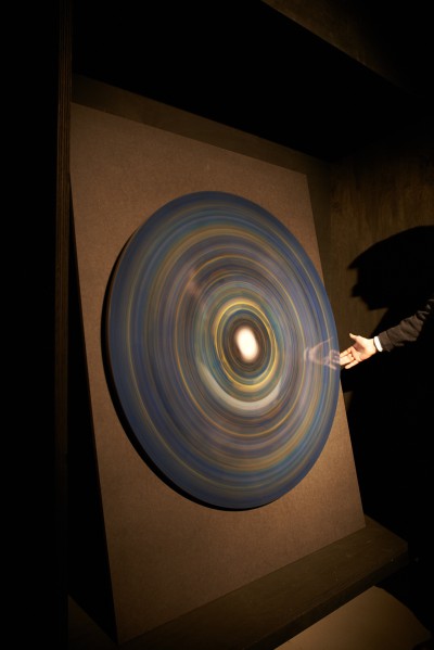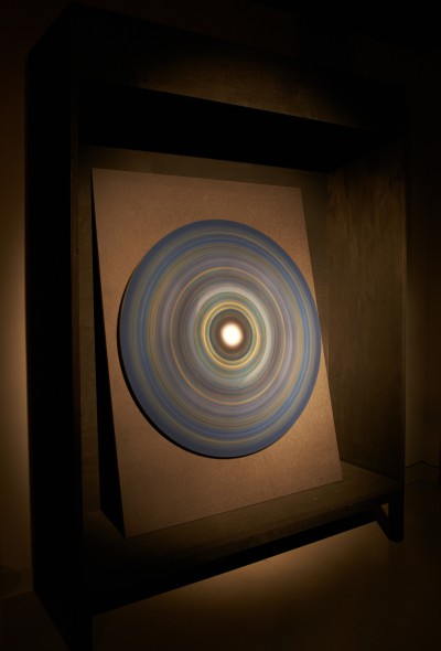 Die von Johannes Schlichting eigens für den ITO-Raum konzipierte Ausstellung Münze des Absoluten – Antwort der Finsternis* besteht aus drei Komponenten. Alle drei zusammen verstehen sich als eine aus visuellen und akustischen Elementen bestehende Collage. "Münze des Absoluten" ist der Titel des ausgestellten Bildes, eines kreisförmigen Prints, welcher – wie ein Glücksrad drehbar – in unterschiedlichen Positionen zum Stillstand kommt. "Antwort der Finsternis" ist der Titel einer Filmcollage, welche Fragmente unterschiedlicher Herkunft verfremdet und zu einem eigenen filmischen Text komponiert. In demselben Verfahren ist drittens eine Ausstellungs-Tonspur entstanden.