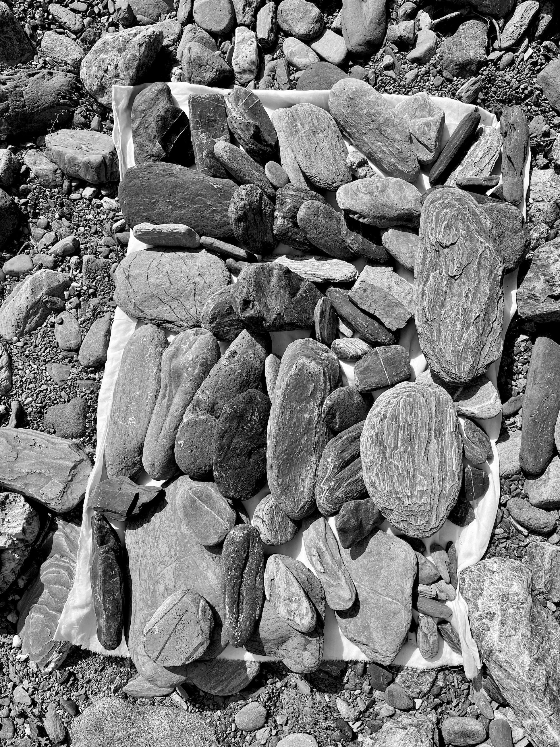 Während ihres Aufenthaltes erkundeten Granser und Theil nur die Umgebung um die Hütte, die sie bewohnten, und Orte, die sie im Rahmen einer Tageswanderung erreichen konnten. Selbst dieser eingeschränkte Radius hatte auf beide eine enorme Wirkung. Auf ihrem "Pilgerweg im Kleinen“ sammelten Sie nach und nach 88 Steine, die sie der Größe nach sortierten und die Granser schließlich fotografierte.