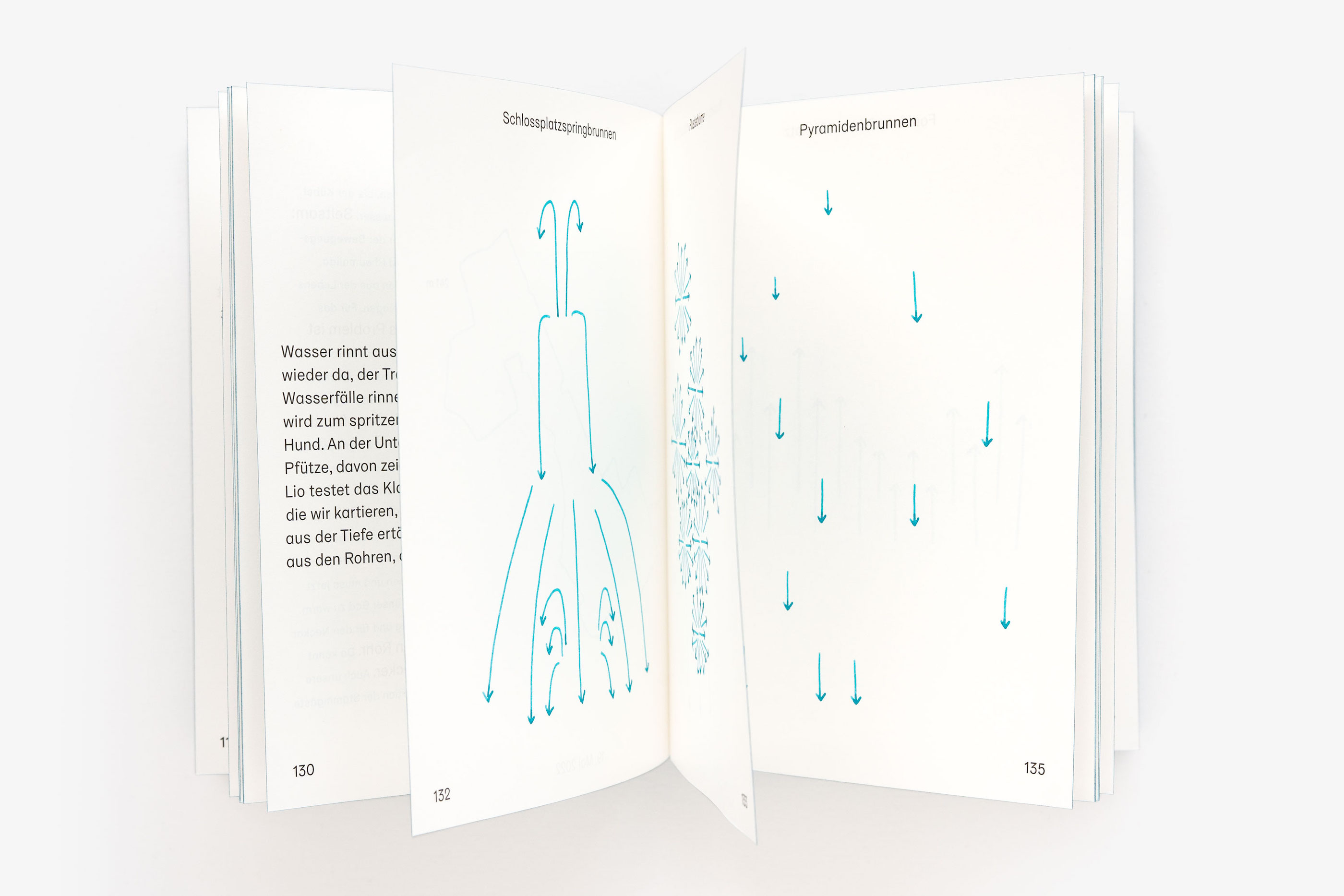 Stuttgarts Sehnsucht nach Wasser ist größer als das Wissen um den tatsächlichen Reichtum an Mineralquellen, Brunnen, Bädern, Bächen, Flüssen, Seen und Ideen. Einen Sommer lang schwimmen Christina Schmid und Aida Nejad durch die Stadt. Sie lauschen Wassergeschichten, sammeln Plätschern, kartieren Gewässer und schauen, was da ist – oder da sein könnte. Sie durchstreifen die Geschichte der Bäderkultur, tauchen ein in Schwimmbadtechnik, Trinkwasserversorgung und die Kanalisation der Stadtentwässerung, ergründen die Sehnsucht nach Wasser als Charakterzug der Stadt. Die Ergebnisse ihrer Quellenrecherche flossen in ein künstlerisches Logbuch, das die Reise zum Wasser chronologisch dokumentiert. Ein vielstimmiger Wasserchor mischt sich wie Wellen in 140 experimentelle Texte, Brunnengedichte und Wasserträume von Christina Schmid, Daneben leuchten in türkiser Tinte 100 Wasserzeichnungen und Brunnenchoreografien von Aida Nejad. Eine handgezeichnete Stadtwasserkarte liegt als Lesezeichen im türkisblauen Pool.