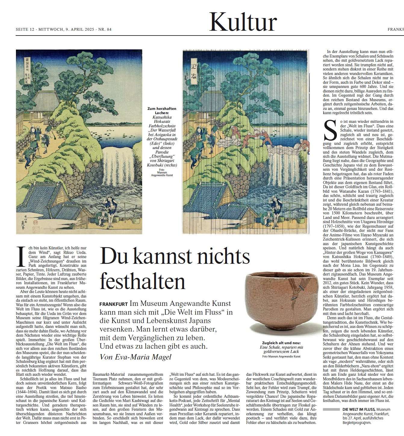 Jahrhunderte alte verwitterte Holzskulpturen, Keramiken und Lackarbeiten, Hokusais Große Welle als archetypischer Ausdruck von Schönheit und tödlicher Gefahr, der Wind als Zeichner, der Tee als Kommunikationsmittel: Das Museum Angewandte Kunst Frankfurt zeigt in der Ausstellung ‘Die Welt im Fluss‘ kostbare Sammlungsbestände des Museums, ergänzt durch ausgewählte Positionen der Gegenwartskunst. Die ausgestellten Objekte und Exponate beschreiben Japan als ein Land, das eine besondere ästhetische Sprache des Ephemeren hervorgebracht hat. Wo von einem Moment auf den anderen durch Erdbeben, Flutwellen oder auch durch menschengemachte Katastrophen das Leben ein jähes Ende nehmen kann, blüht eine Kunst, die sich der Fragilität und Kostbarkeit unserer Existenz stets bewusst ist.