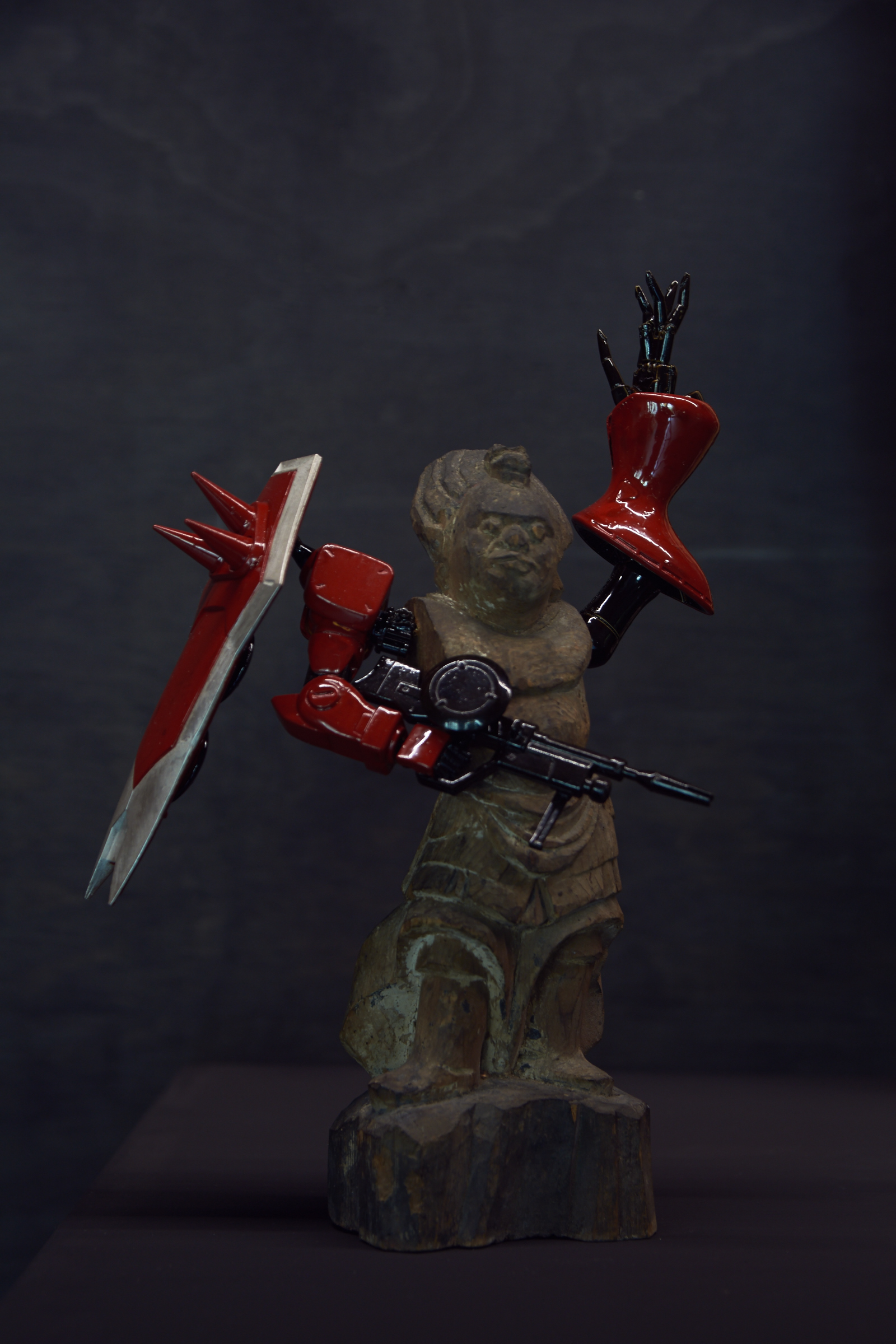 Akihiro Higuchi's fein inszeniertes Spiel mit Kultur, Natur und Kreatur zeugt von einer ästhetisch anspielungsreichen Raffinesse, die in Japan in der Tradition des Mitate, einer ursprünglichen literarischen Form der Beschreibung steht. Unter Mitate versteht man auch das Spiel mit assoziativen Stellvertretern vorgegebener Formen. Berühmte Meister der Teezeremonie aus dem 16. Jahrhundert etwa ersetzten wertvolle Teeschalen durch formverwandte, jedoch minderwertige, nicht für den Teegenuss vorgesehene Gefäße. Die Kunst des Mitate zeigt sich ebenso in den animalischen Werken von Akihiro Higuchi. Etwa darin, dass der Künstler mit dem schelllackähnlichen Glanz der Käfer auf die glänzende Lackoberfläche japanischer Schalen und Gefäße anspielt. In doppelter Hinsicht ersetzt Natur damit den kulturellen Hintergrund, als materieller Bildträger sowie als perfekter Ersatz für einen malerisch erzeugten Untergrund. Ähnlich verfährt Higuchi mit bunten und populären Spielzeugfiguren, die er neben klassische Götterdarstellungen platziert. Die Figuren aus den gegensätzlichen Welten von High and Low haben jedoch eines gemeinsam: ihre Körperhaltung, die sich nach einem tradierten Kanon ausrichtet.