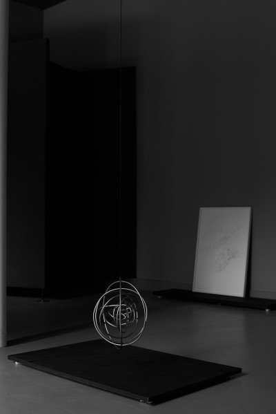 Flaches Papier, gefaltet, wölbt sich in den Raum, Spannungen fliehen. Wirbelnd legt sich Schwärze in die Szene, das dunkle Auge des Sturms. Ein Schlag, Risse verbinden sich, ziehen sich über das Glas. Gefurchter Brocken, die Replik eines der unzähligen Gestürzten. Eine Linie windet sich in Kurven und knotet einen Raum. Schwärme pulsieren, lebendige Wolken. Alles fließt.